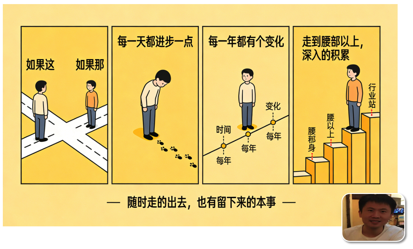 - 如果这,如果那,但不如每一天都进步一点,每一年都有个变化。没有哪个绝对的好,也没有绝对的差,每一个行业,领域,都需要走到腰部以上,深入的积累,才可能让自己具备随时走的出去,也有留下来的本事。