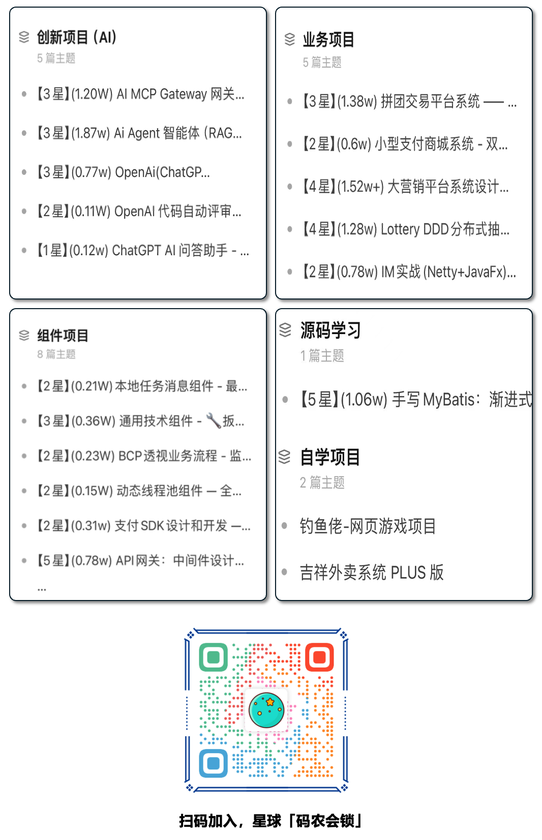 - 2025-04-19《通用技术组件 - 🔧扳手工程》 - 这是一套互联网大厂里的通用解决方案,他们会把共性的诉求,凝练成通用的组件,让各个系统可以复用。像是拼团项目、Ai Agent 项目,都有使用这里的组件能力,让大家真实感受到一个互联网公司级的项目,是怎么做这样的事情的。
