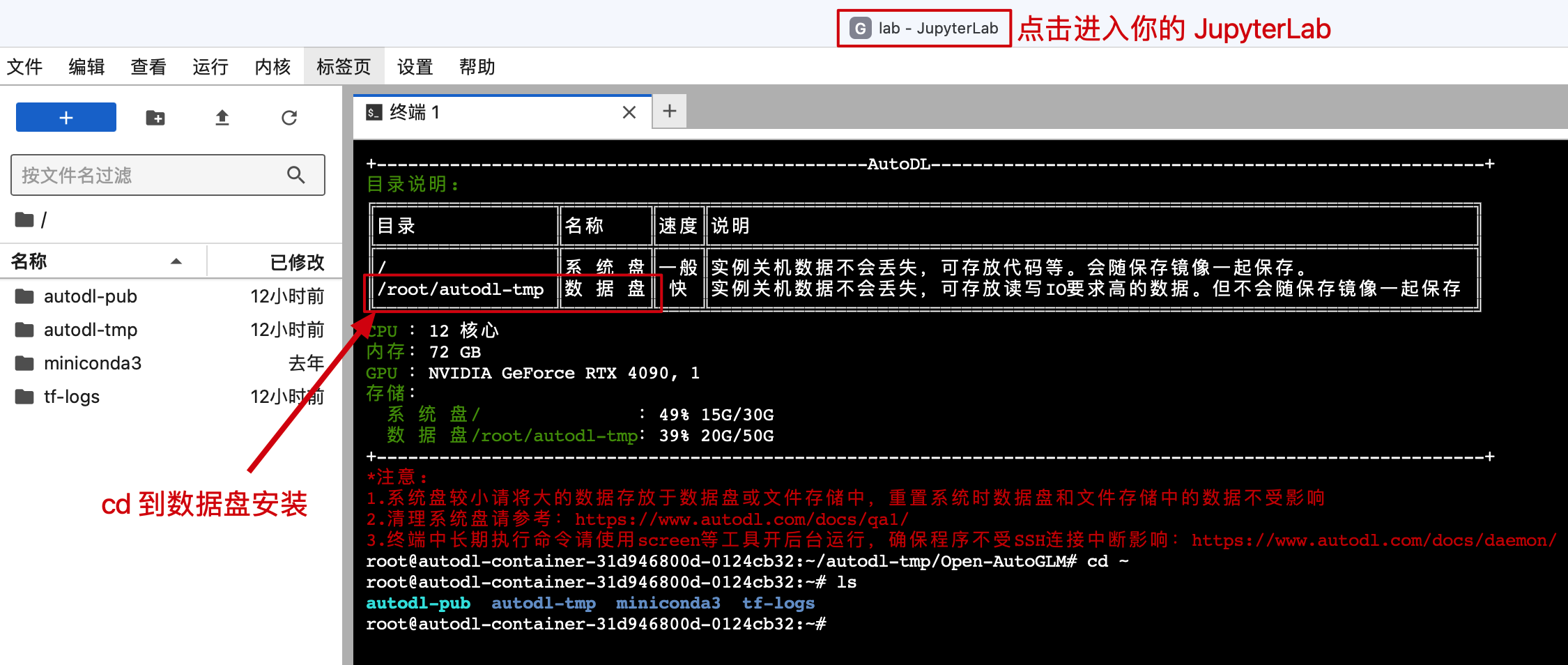 /root/autodl-tmp下,否则系统盘安装满了,就不能运行了。