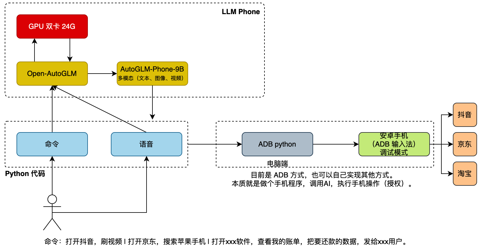 - 整个的过程为,你通过命令调用LLM Phone,之后模型返回的结果,通过 ADB 方式,调用