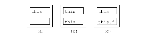 和之前一样,第一条指令将 this 压入操作数栈。第二条指令压入局部变量 1,在为这个方法调用创建帧期间,以 f 参数初始化该变量。第三条指令弹出这两个值,并将 int 值存储在被引用对象的 f 字段中,即存储在 this.f 中。最后一条指令在源代码中是隐式的,但在编译后的代码中却是强制的,销毁当前执行帧,并返回调用者。这个方法执行帧的持续状态如图 3.3 所示。