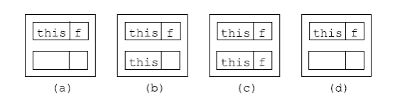 setF 方法的持续状态:a) 初始状态,b) 在 ALOAD 0 之后,c)在 ILOAD 1 之后,d) 在 PUTFIELD 之后