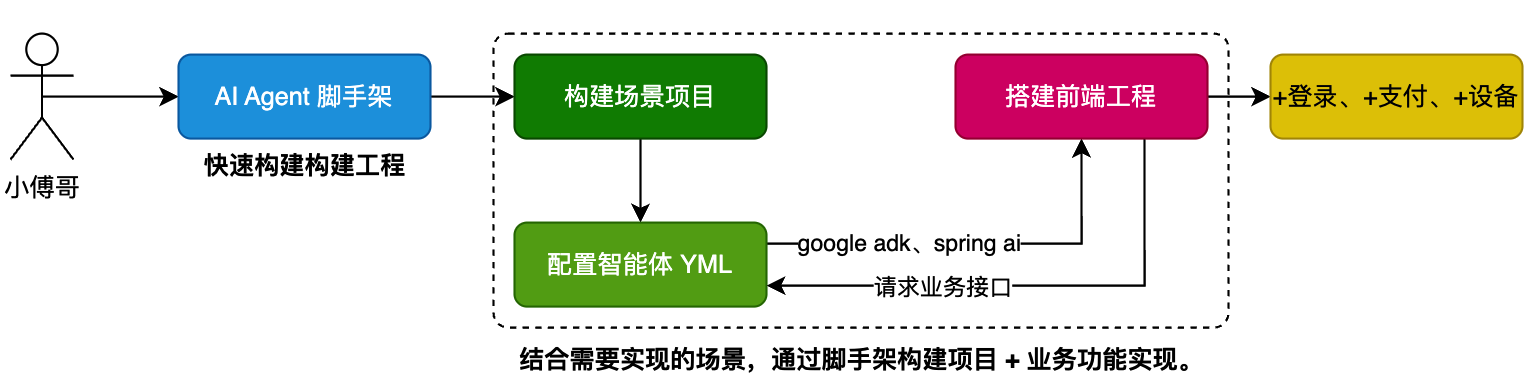- 2025年11月27日,Google 正式在 Maven 仓库管理中心,推送了 0.4.0 版本 ADK,该版本新增加了 Spring AI 的集成。google-adk-spring-ai (opens new window) 至此,也因此,小傅哥决定基于这套服务组合,设计智能体脚手架。