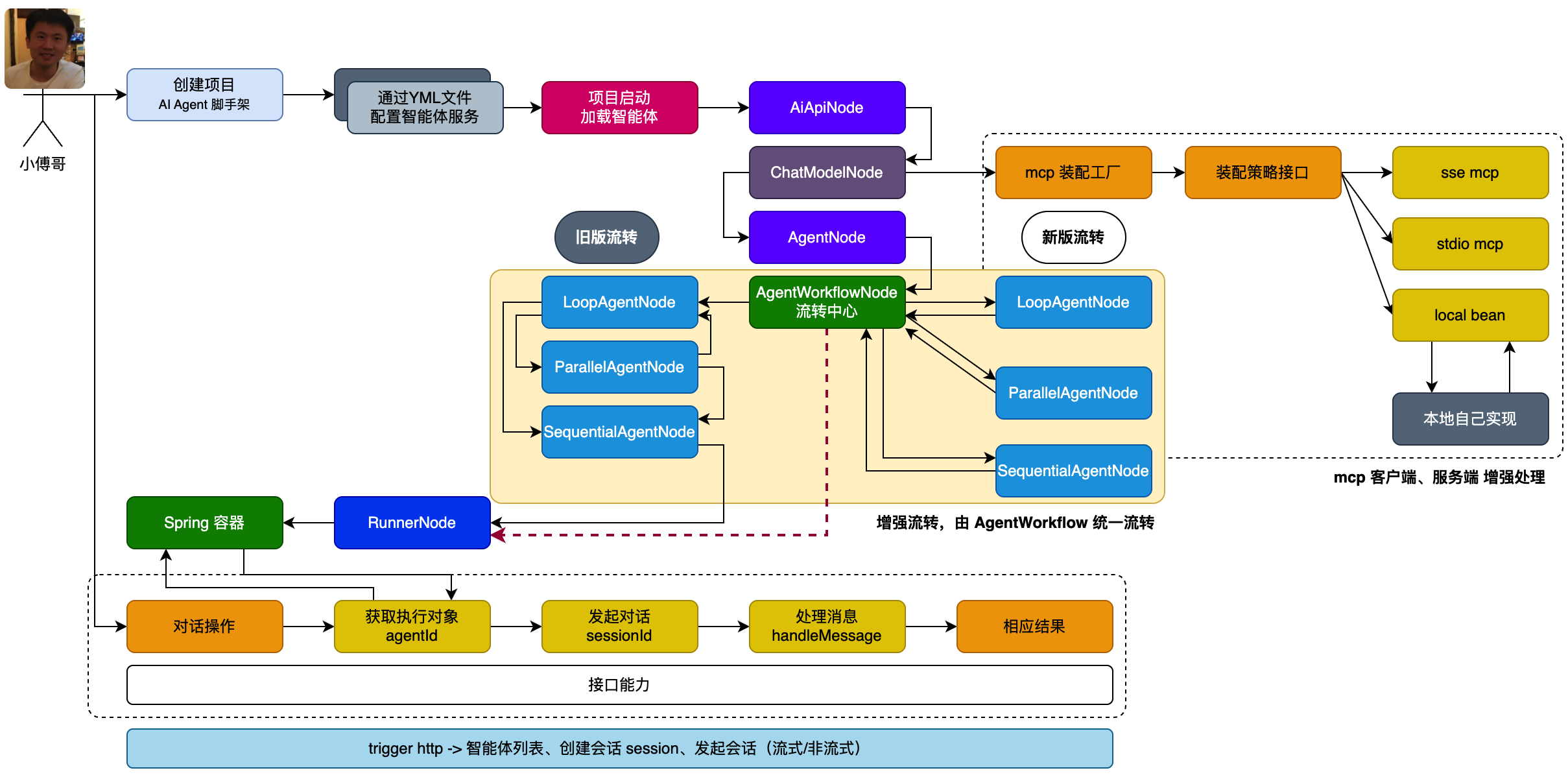 - 首先,从用户基于脚手架创建完成后,在使用 YML 文件进行智能体的配置,之后在启动项目后,会进行一些利的装配。api、model、agent、workflow、runner,再到 spring 容器。