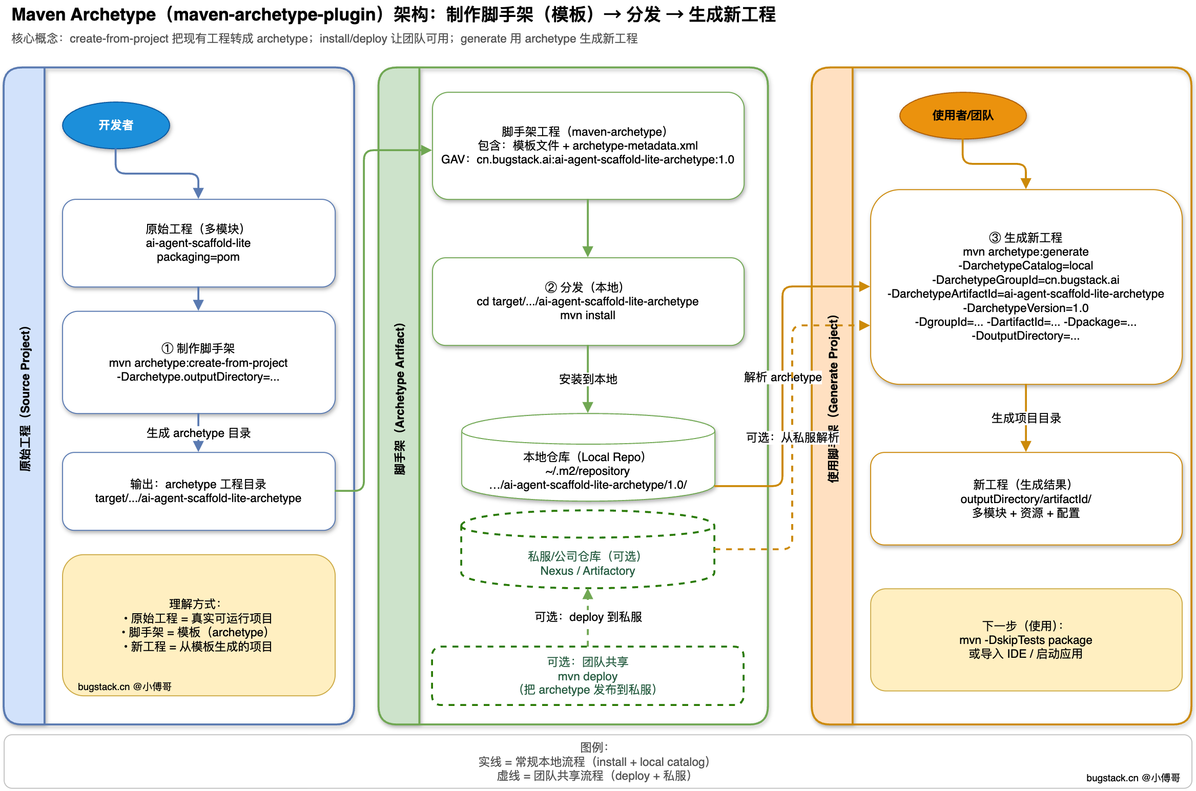 - 左侧,对现有工程使用 maven-archetype-plugin 插件,构建工程脚手架。将当前的工程打包成一个可复用的 Archetype 模板。