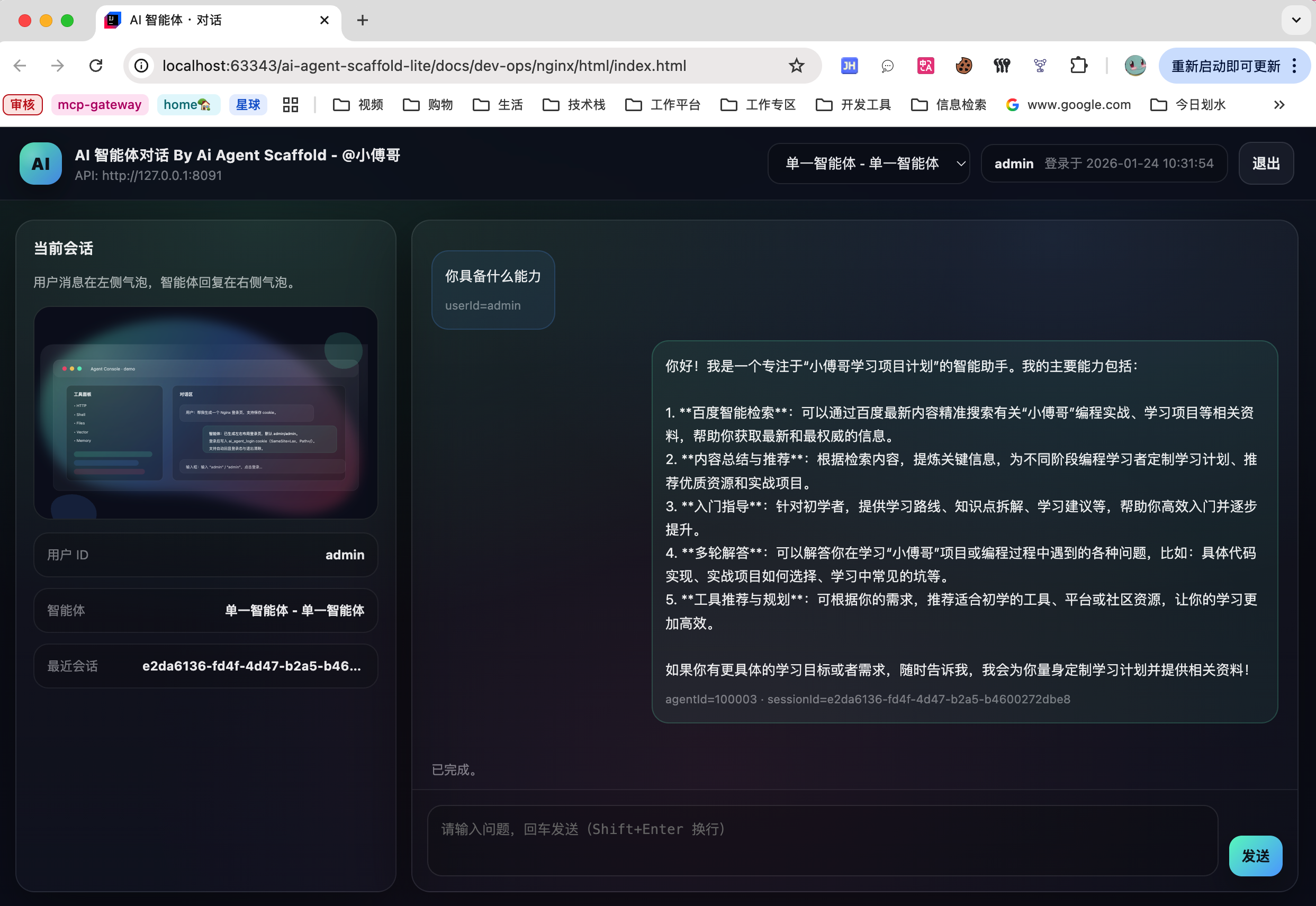 好,该项目为大家带来一套企业级 AI Agent 智能体脚手架底座及场景应用方案的实战编程项目。项目采用 Spring AI、Langchain4j(对照学习) + Google ADK(a2a 框架 + 工作流编排),融合 MCP、Skills、Plugin、Session 等多项智能体开发技术,构建通用智能体脚手架工程。