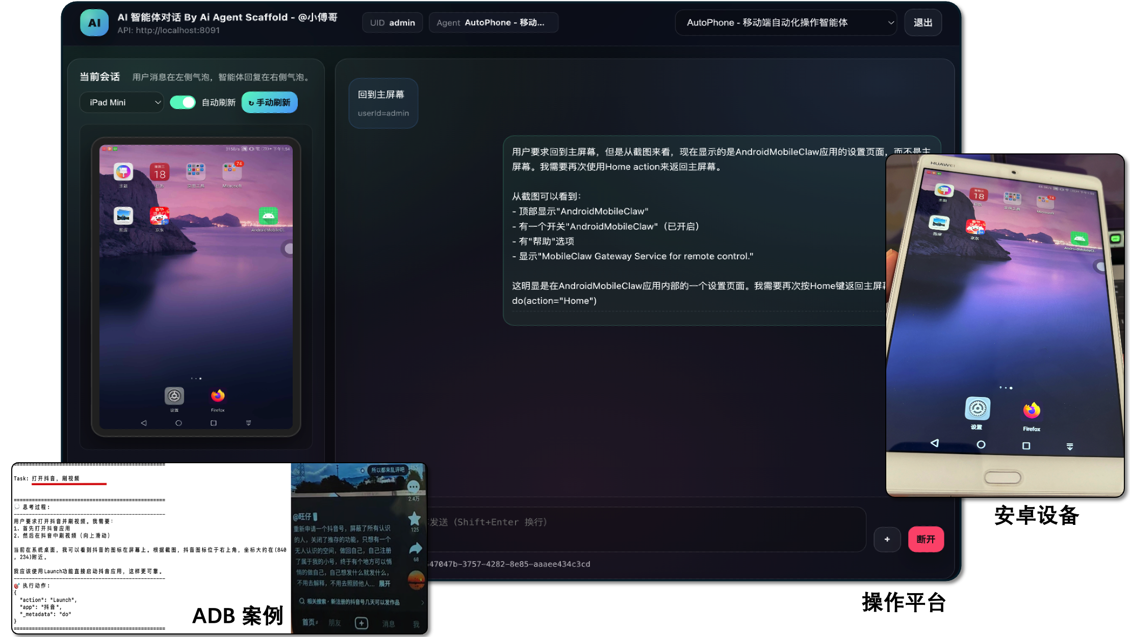 并借助该脚手架,用户能够快速高效地搭建各类智能体应用场景。就像本次项目,既带着你搭建脚手架,也带着你使用脚手架做场景用(价值超级大,还要带着你做手机版大龙虾 MobileOpenClaw 🦞!)。