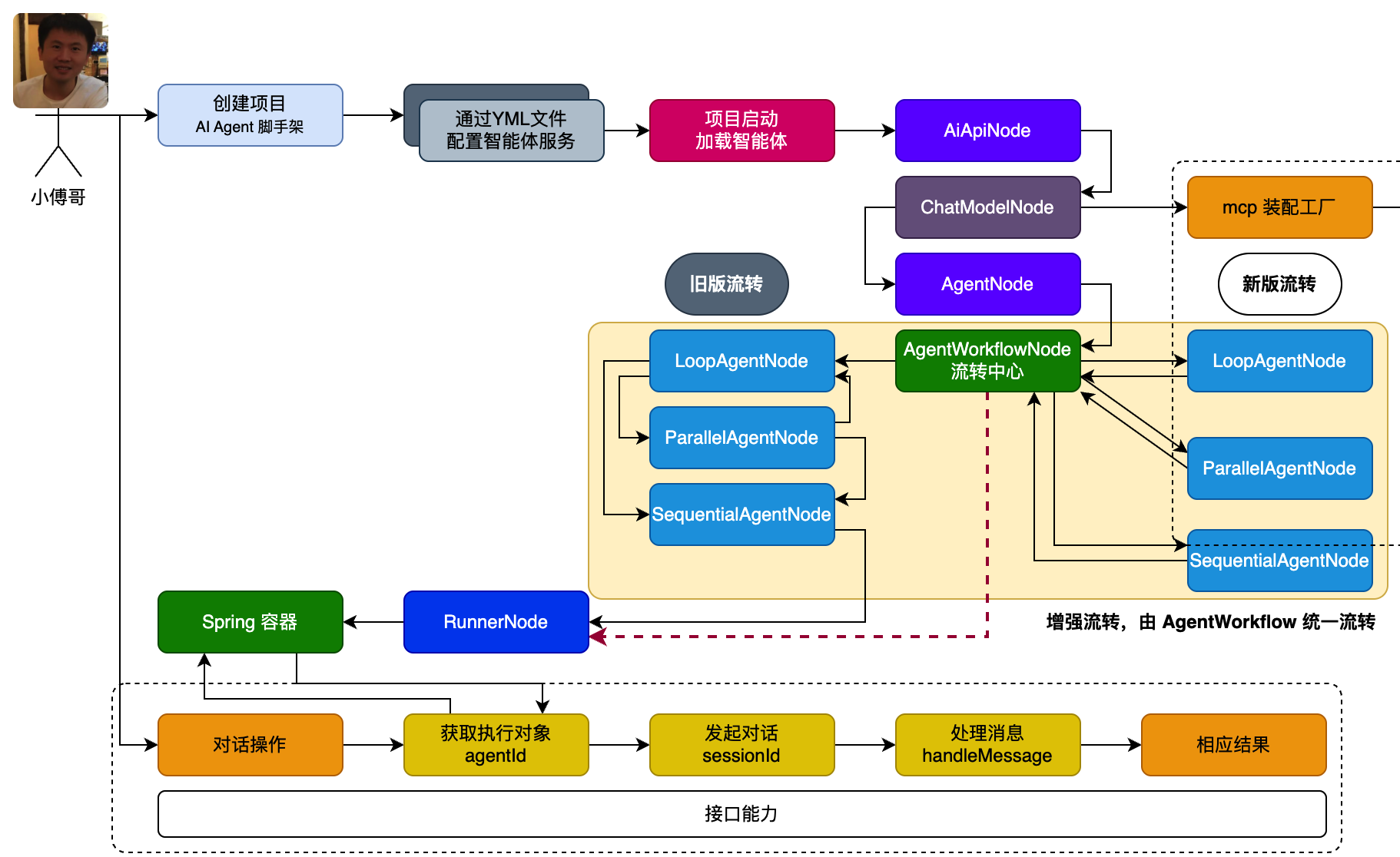在智能体完成装配以后,接下来我们要做的就是提供标准的会话服务接口能力,使用智能体。这包括了,所装配智能体的列表(agentId)、会话的创建、消息的处理(同步/异步)。