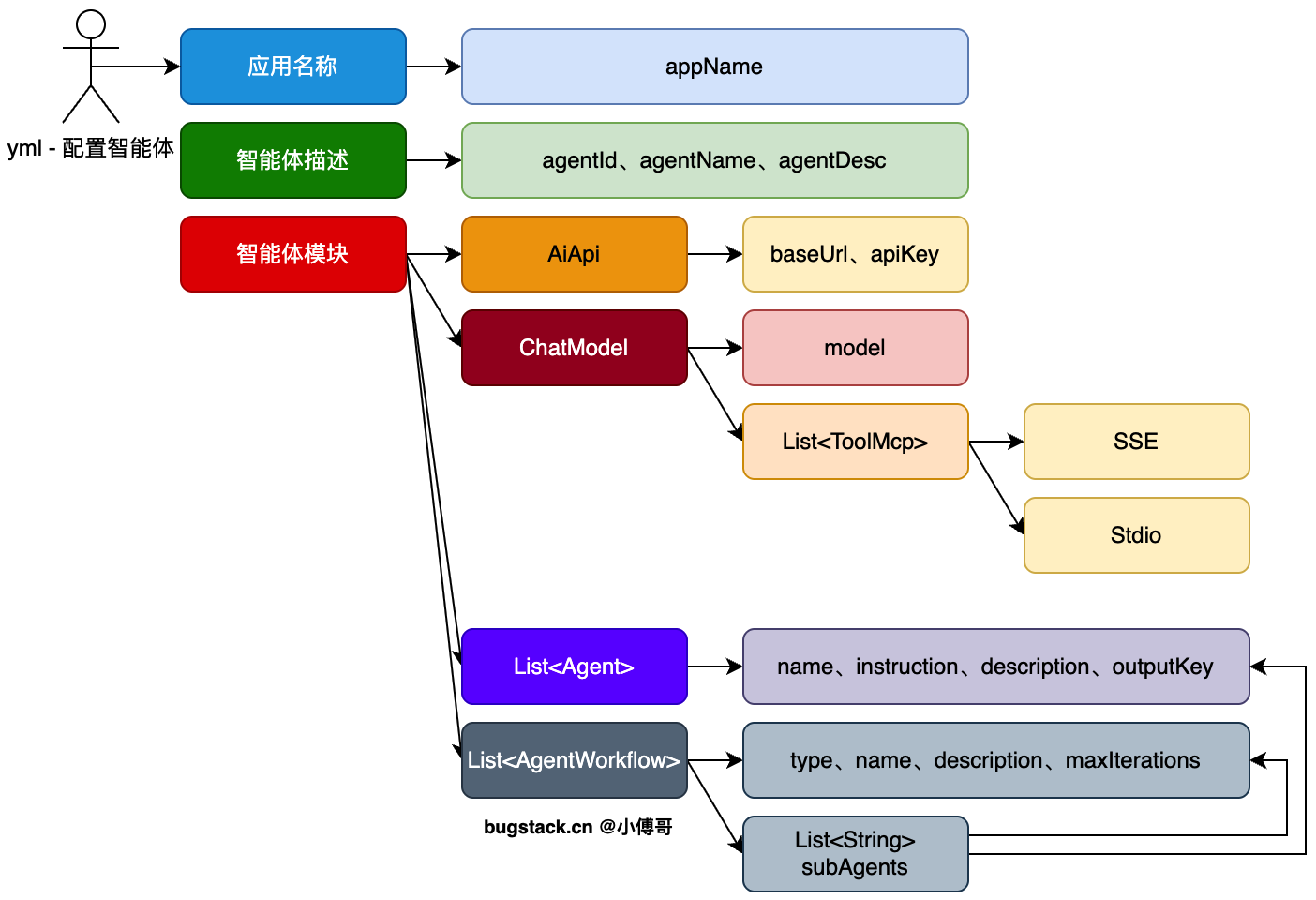 定义使用工程 YML 文件方式,配置的通用的智能体配置表。允许用户在使用脚手架创建完成智能体后工程后,通过 YML 配置出自己需要的智能体,在结合业务场景做对应的衔接开发。