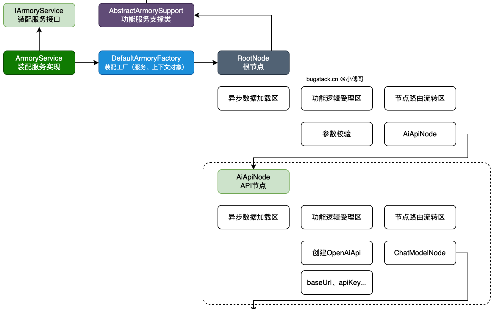 AiApiNode 节点的装配,使用的是 Spring AI 框架提供的构建方法。在咱们课程前面也讲解过 LangChain4j,后面如果你想锻炼,也可以更换下,完全都是可以到 Agent 装配的时候做兼容的。