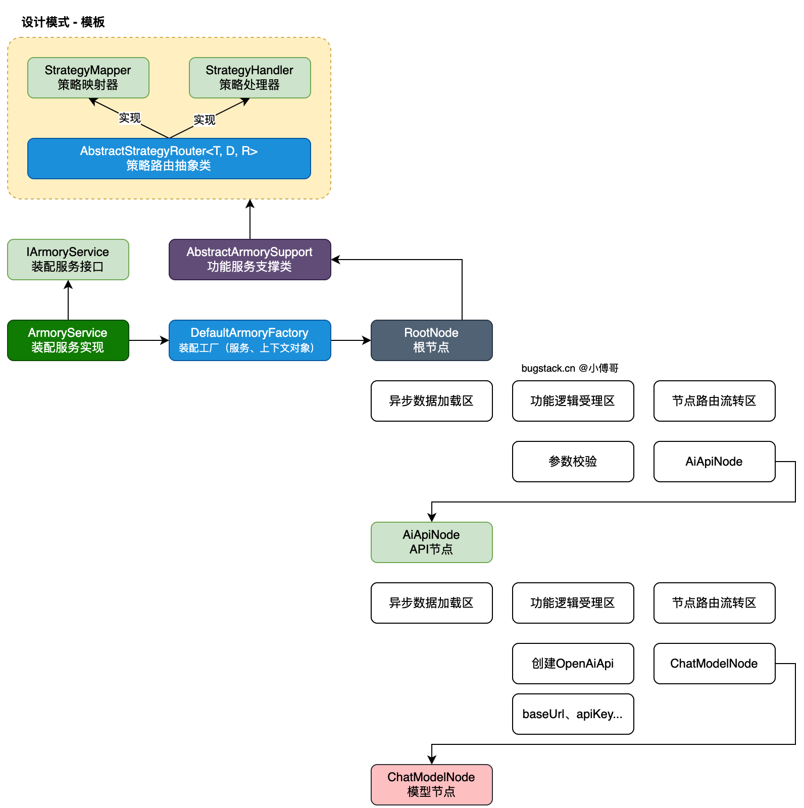 • 首先,最上面的是规则树(组合模式)的设计模块框架,用于各项节点流转实现,如;RootNode、AiApiNode、ChatModelNode 等。