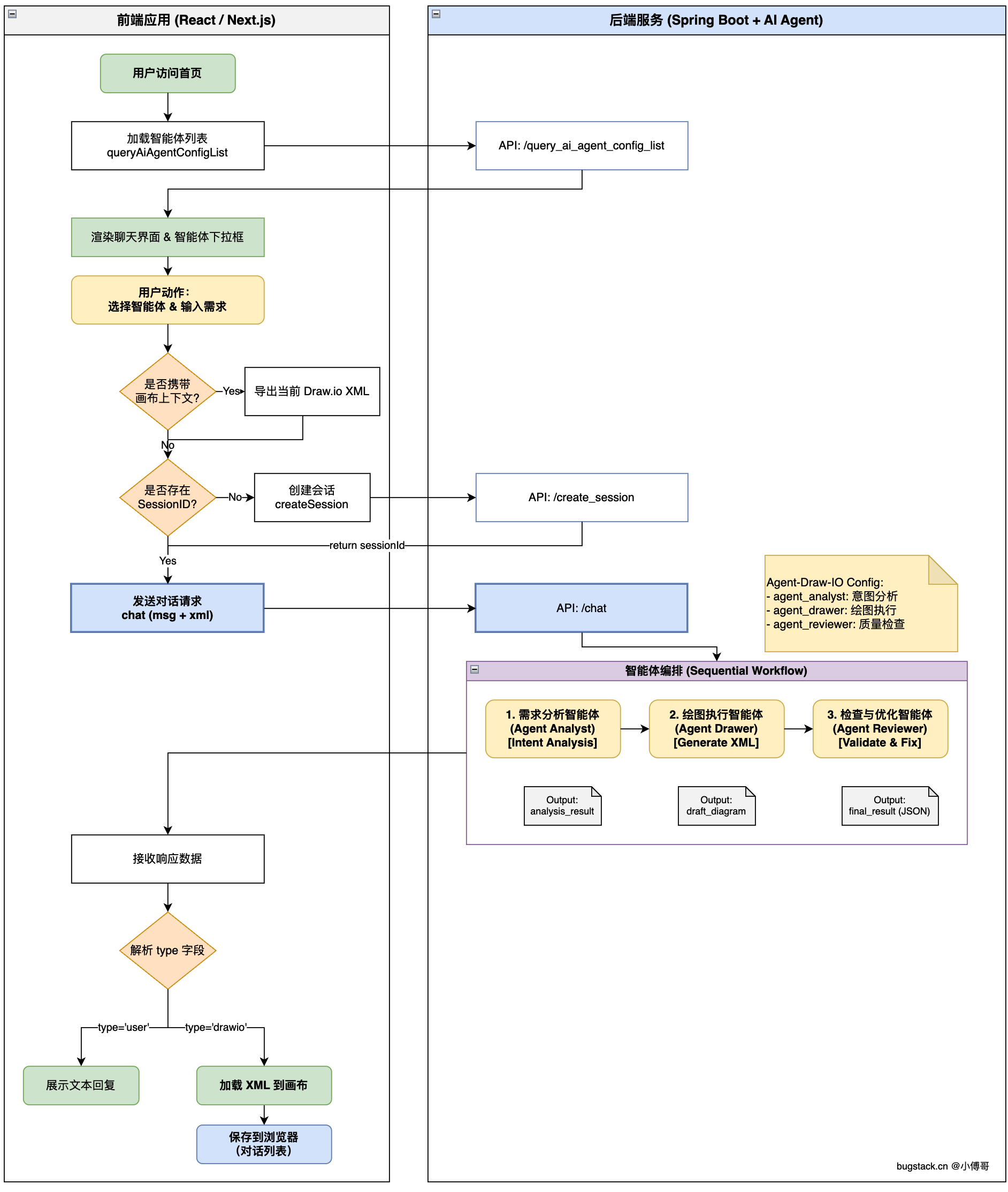 - 之后,因为服务端智能体返回的不再是一个 draw.io 的 xml,所以要对 agent 智能体返回的结果,进行序列化成对象,再返回给前端。前端拿到结果后要对不同的类型的结果,反馈给用户(user)、渲染到 draw.io 页面(xml)。
