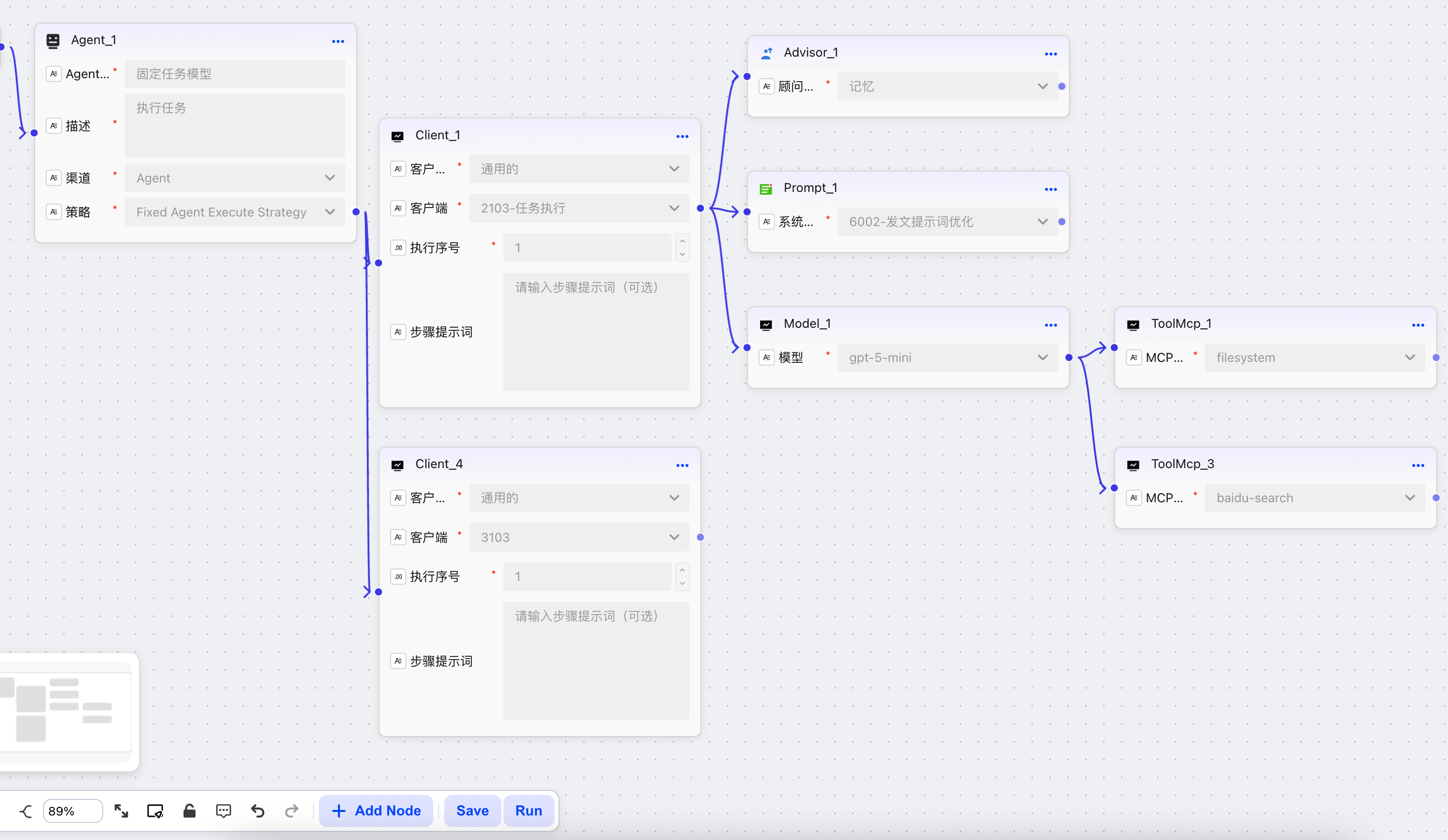 - 对于这些节点所拉取的数据,则是从服务端接口进行获取的。如,Client 客户端获取可用数据,Model 获取模型,之后链接的 MCP 工具可以自由组合。