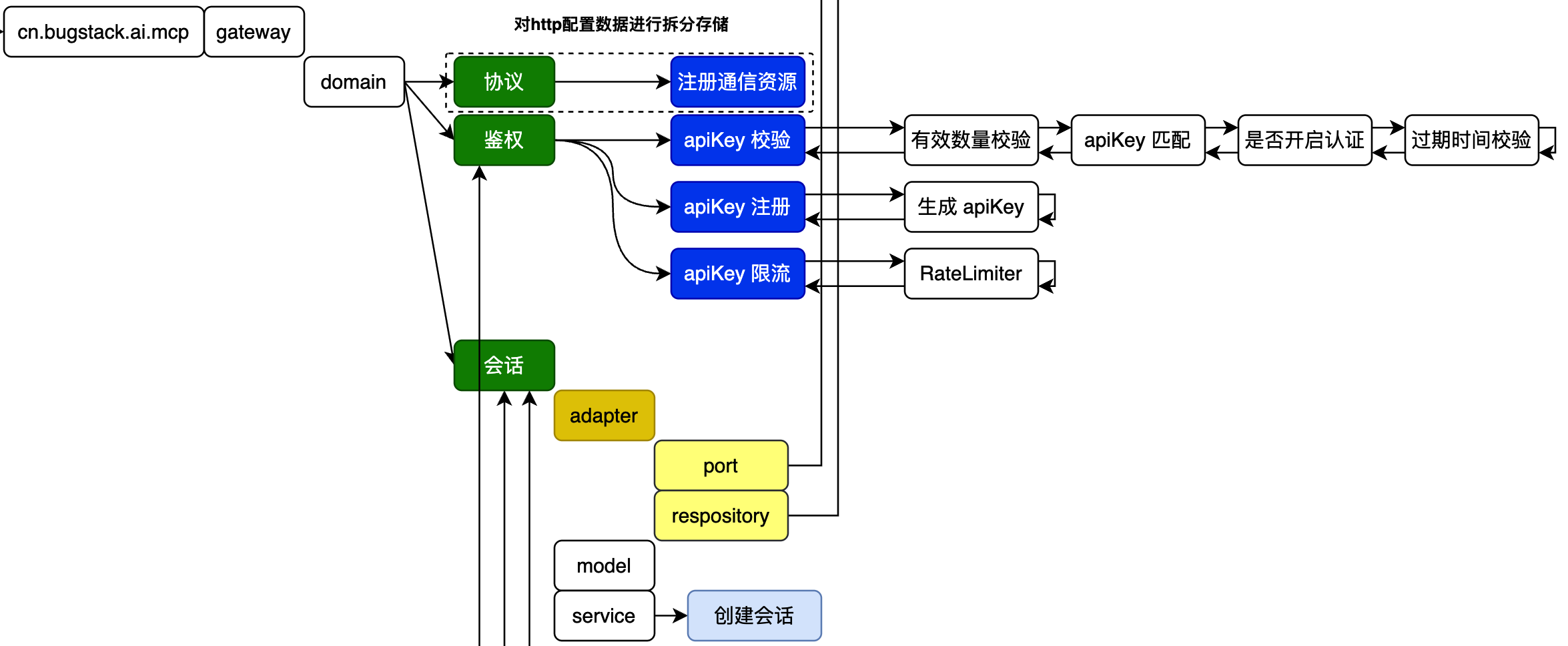 设计 MCP 网关通信过程中的鉴权领域功能,包括;权限注册、请求限流、权限校验,这样3个主要的服务能力。领域层设计好后,就可以让 case 串联逻辑完成权限功能的使用了。