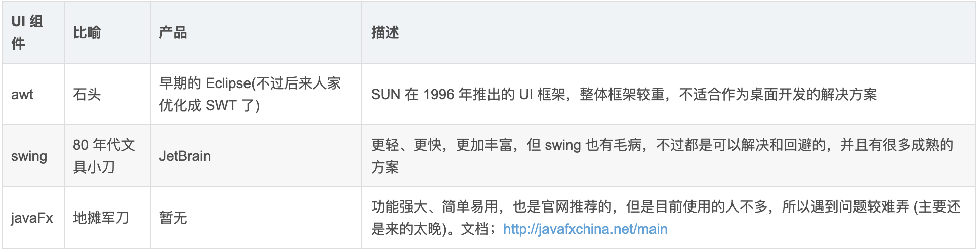在 Java 语言桌面版开发中,直至目前共提供了三套 UI 开发方式;Awt、Swing、JavaFx,以及一些扩展组件 SWT 等。在这三套 UI 组件中,JavaFx 是最新也是最为好用的,因为他提供了丰富的功能,以及 XML 定义、CSS 设计,因此这也是我们这次选择 JavaFx 开发 UI 的原因。以下是给出的对比图;