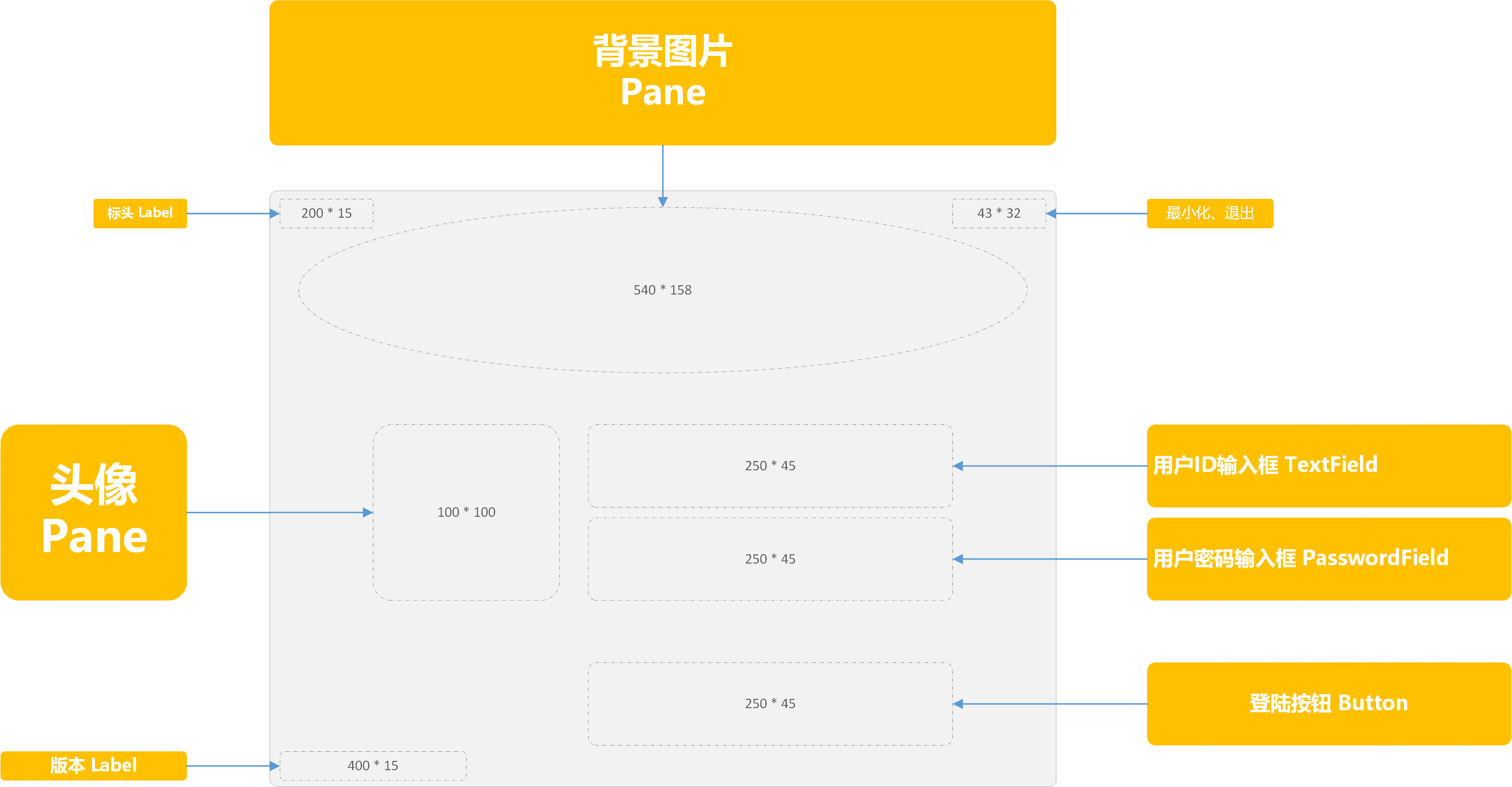 在 JavaFx 中,一个框体包含;窗口 (Stage)、场景(Scene)、布局(Pane)、控件(Button 等) 这四方面内容。而开发过程中可以使用 xml 和编码两种方式进行处理,一般一些预定好的会使用 xml 结构,如果是随着我们业务行为触达而产生的会开发到代码中来生成。