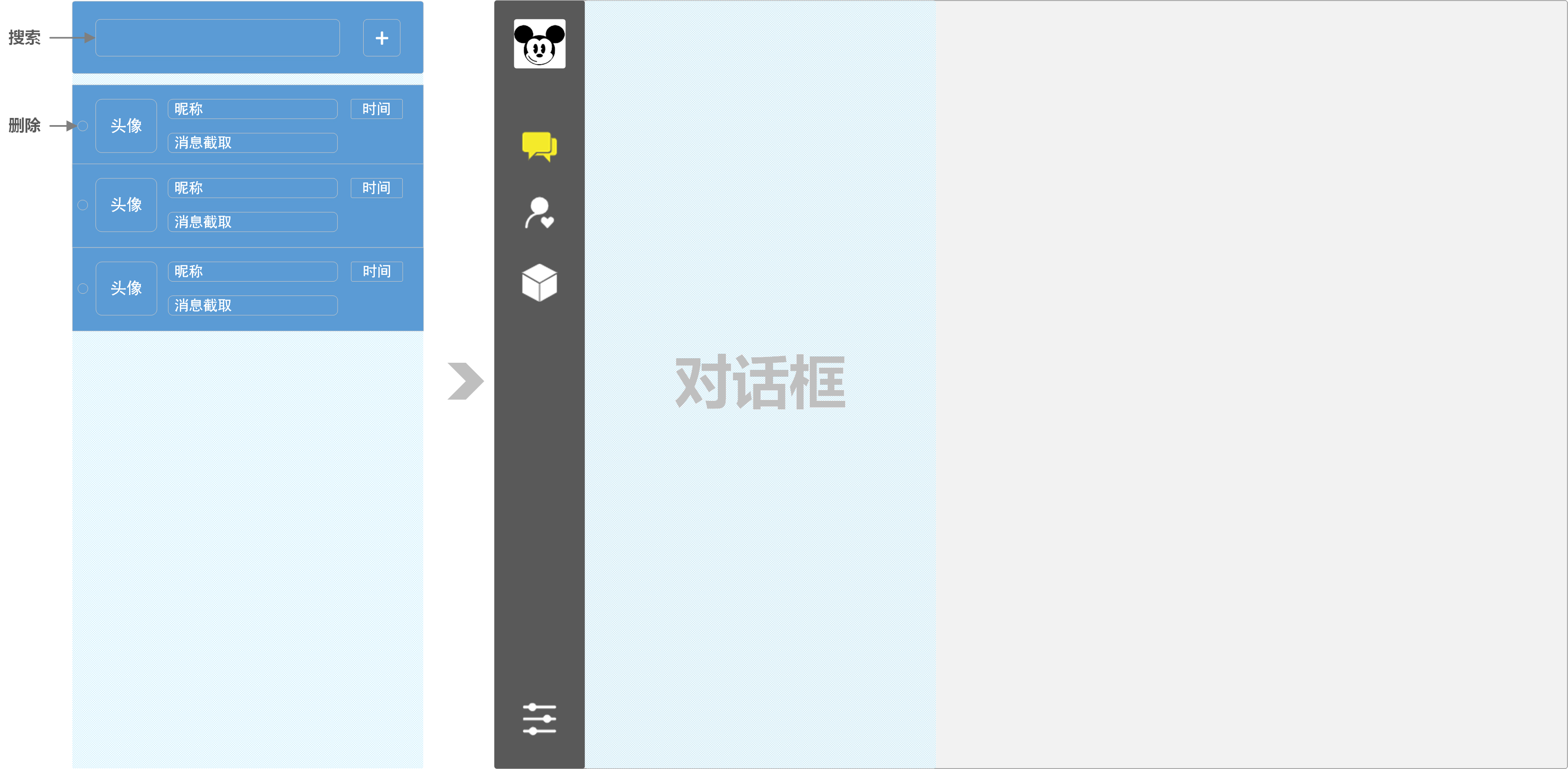 - 在对话框框体中,最上面是搜索和添加群组的功能,这部分我们暂时不保留不实现具体功能。