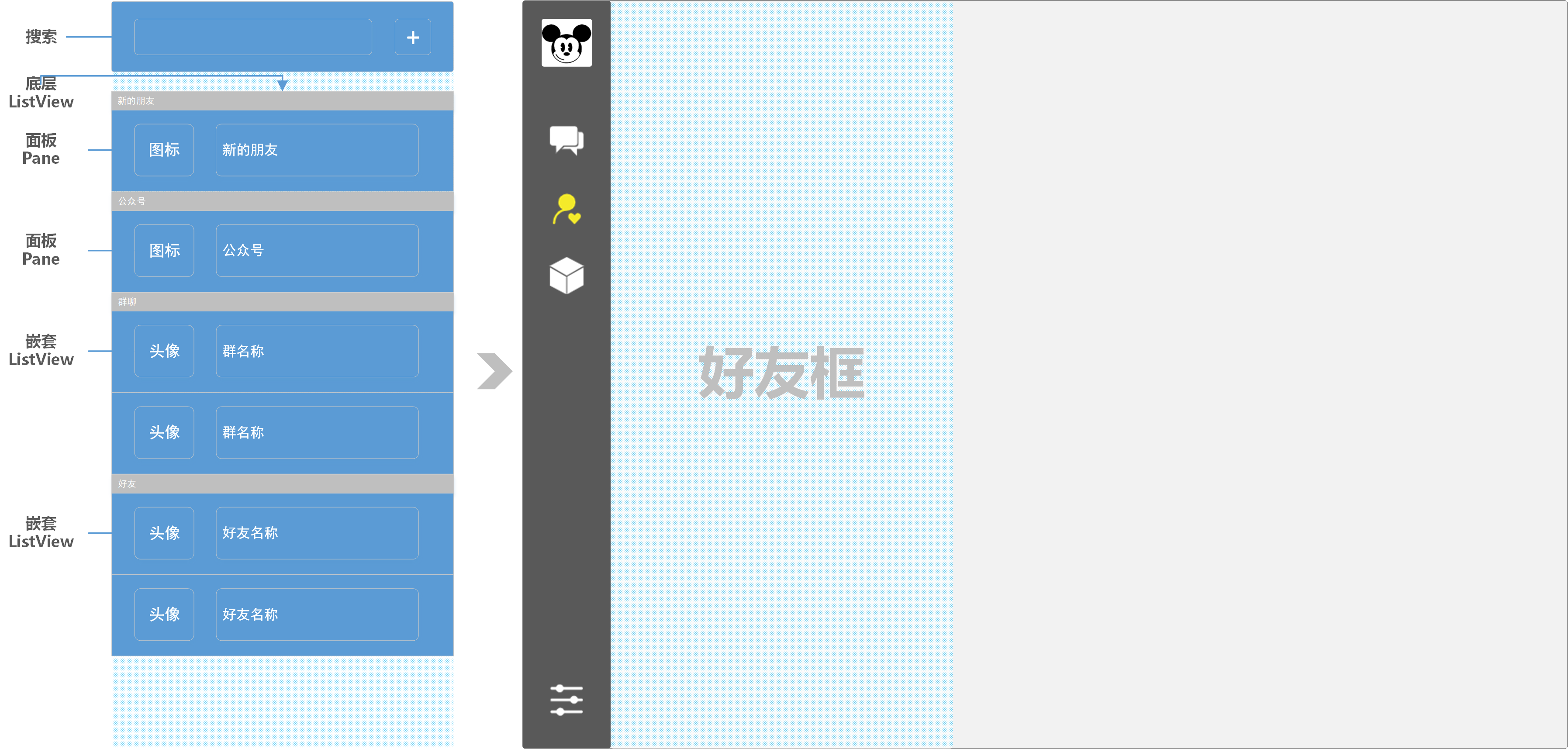 - 经过我们的分析,在使用 JavaFx 组件开发为基础下,这部分是一种嵌套 ListView,也就是最底层的面板是一个 ListView,好友和群组有各是一个 ListView,这样处理后我们会很方便的进行数据填充。