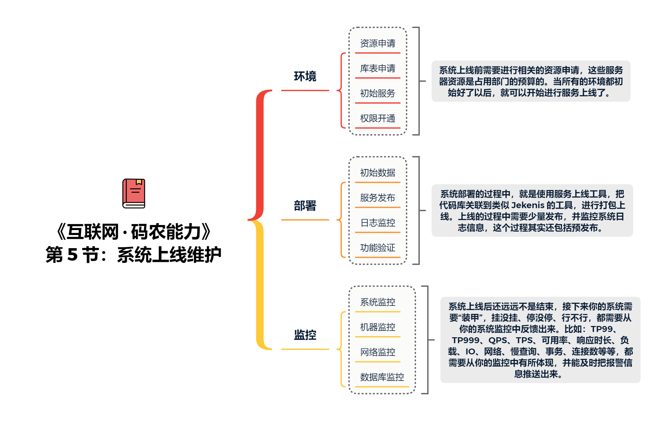 在系统部署阶段,一般公司内部可能会因为系统的使用范围有不同的上线标准,可能有些是手动发布,有些是服务上云弹性发布。那么这些手动发布的系统一般是基于 Jekenis 实现的部署工具,上线发布的过程基本也类似,可以半自动化发布,一台或者多台服务部署。部署的过程需要特别注意:日志打印的信息,RPC接口挂载情况,外部调用链接情况,指定IP调用的返回情况等,当所有你需要验证的功能都完毕后,在逐步选中其他服务进行20%、30%这样的量进行发布上线。