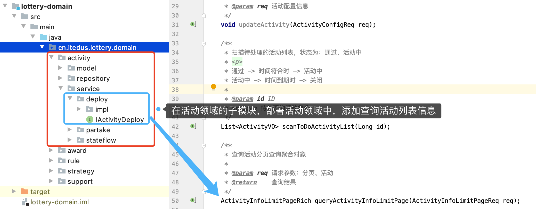 单库单表中,所以所以直接提供查询服务即可。 - 那么在我们的 Lottery 工程中需要添加这样一个提供查询活动部署信息的接口后,就会在接口层、应用层,分别需要添加出新的包分层,否则就会出现vo、req、res混合到一起,不利于维护。这部分看代码的修改会更有感触