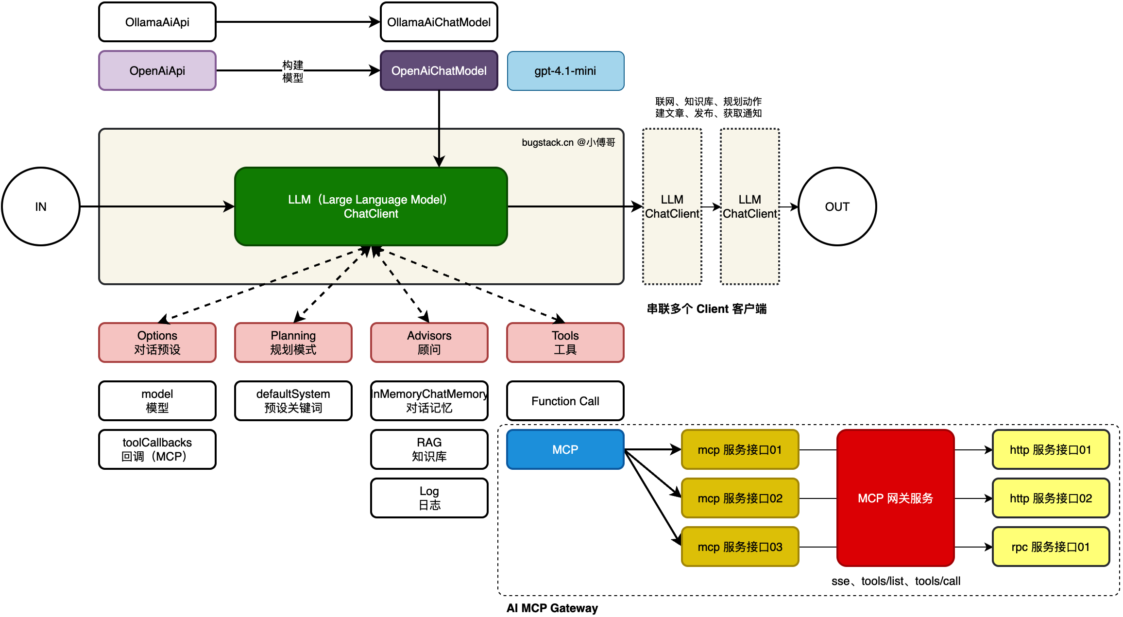 • 为了更好的体现出 AI 和 MCP 的交互,这里小傅哥会带着你做一个 AI 的代理接口,来调试观察 MCP 协议的传输。