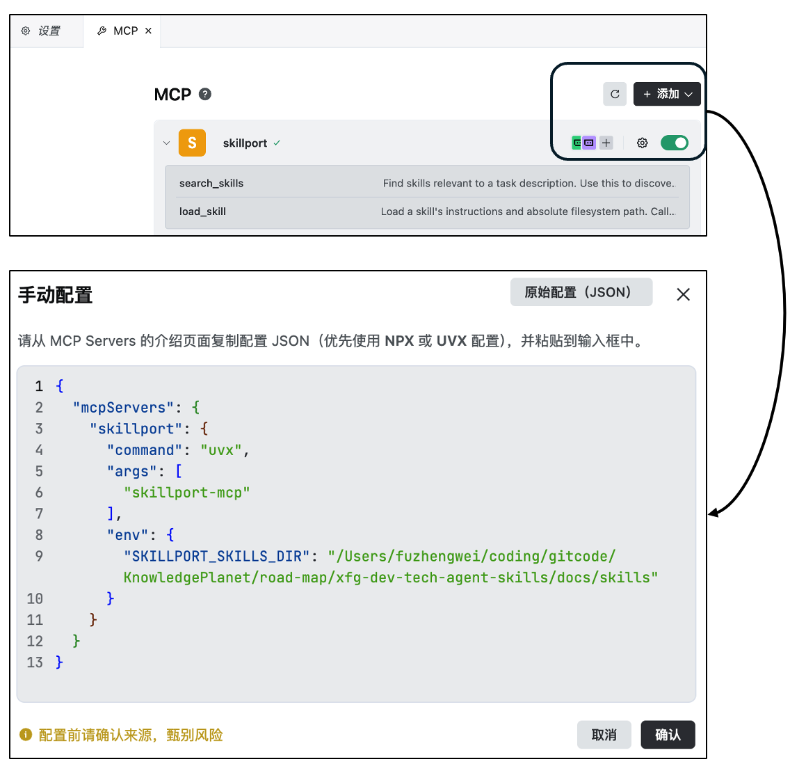 skillport-mcp配置进去使用。如小傅哥带着做 AI Agent 智能体项目 (opens new window) 你现在可以加进去更多的扩展操作了。