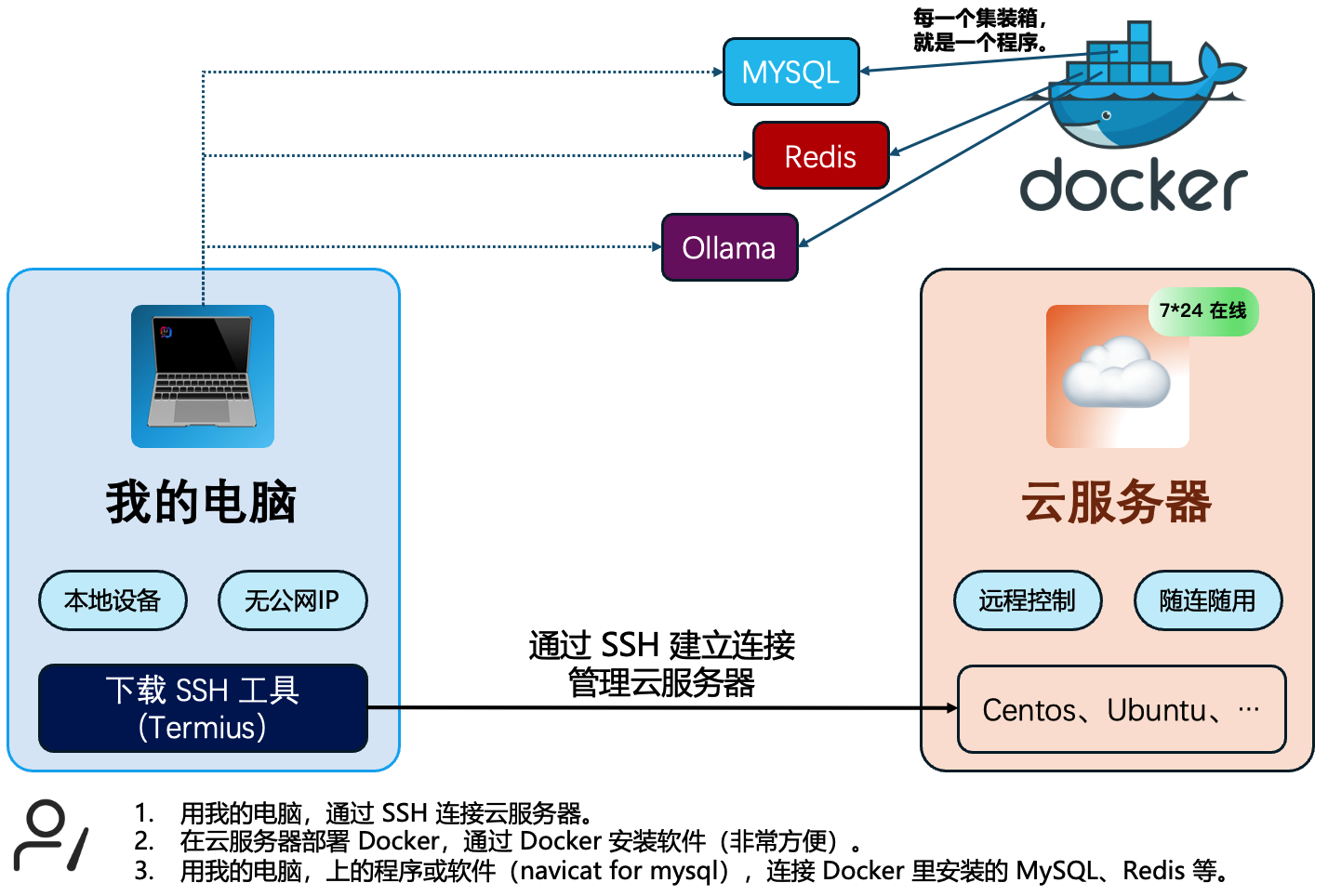 - 云服务器,你可以理解为是你的书桌上摆着的2台电脑。你可以通过其中一台电脑,以 SSH 方式连接另外一台电脑,并在另外一台电脑安装 MySQL、Redis、Ollama 等,以减轻当前这台电脑的压力。让手里的这台电脑只负责代码开发,需要什么资源就连接另外一台电脑的上软件即可。