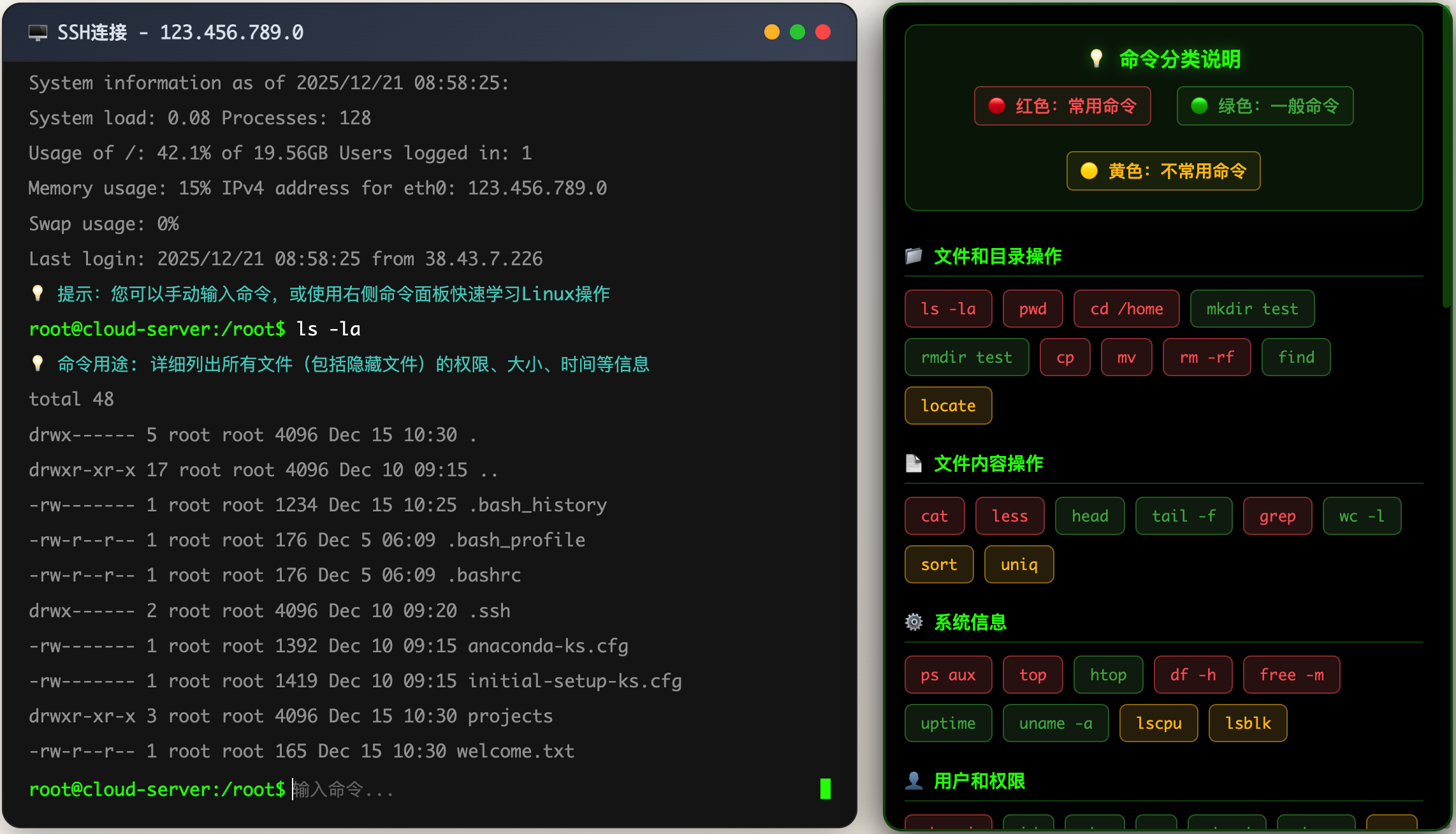 说明:你每点击一个右侧的命令,他就会在左侧进行输入,之后提示命令的用途和效果。这些命令包括了常用的文件、目录、系统、用户的操作,也给大家增加了 Git、Docker、Maven 的命令(右侧往下翻即可)