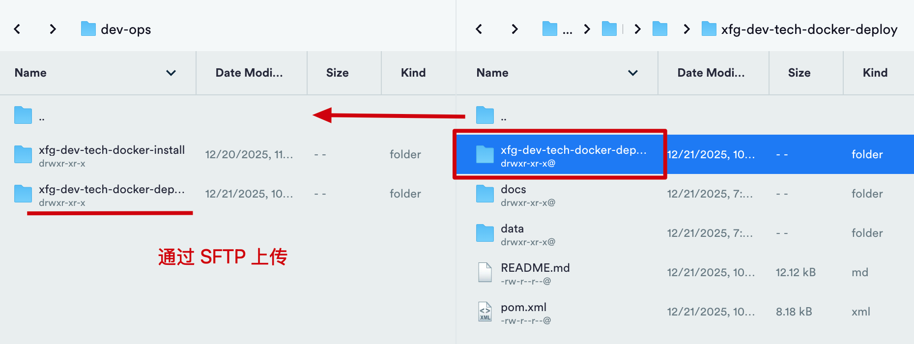 - 上传项目下的部署脚本到云服务器,dev-ops 创建个文件夹。
