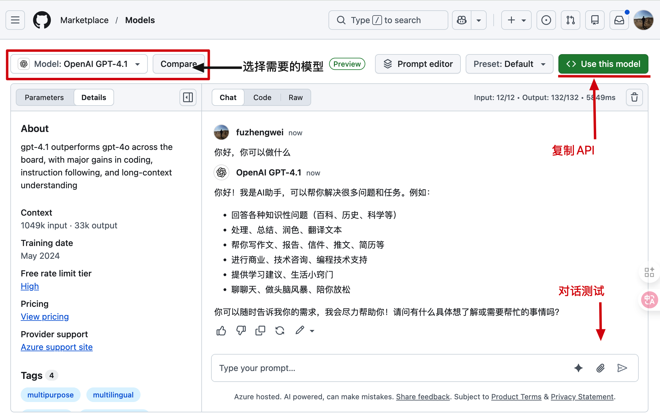 地址:https://github.com/marketplace/models/azure-openai/gpt-4-1/playground (opens new window)