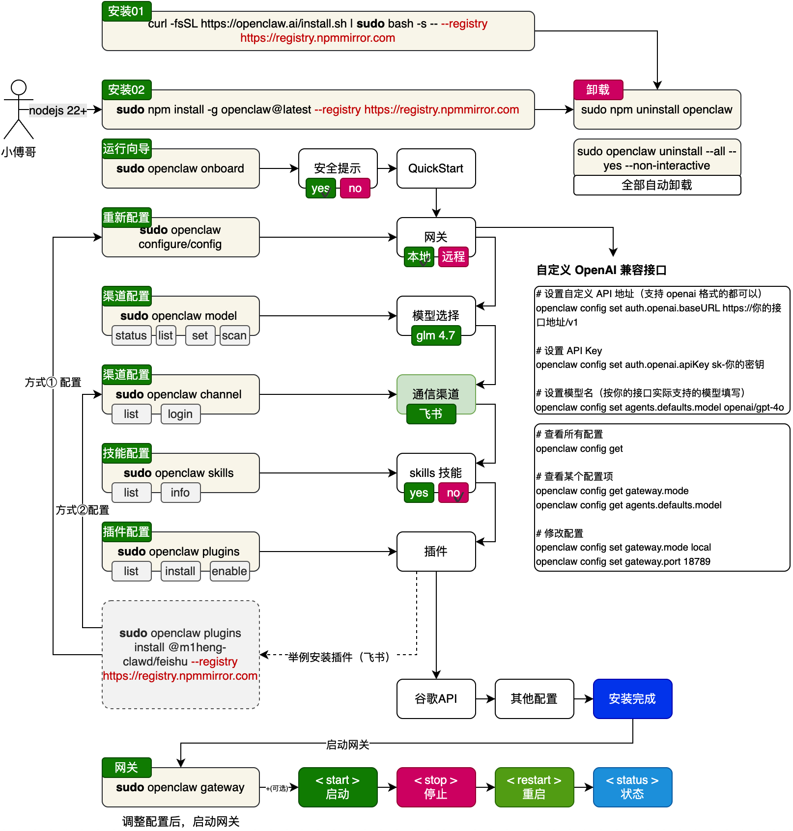 OpenClaw 的安装过程中,会涉及一些列命令的使用,我把这些放到一个图里,方便大家理解;