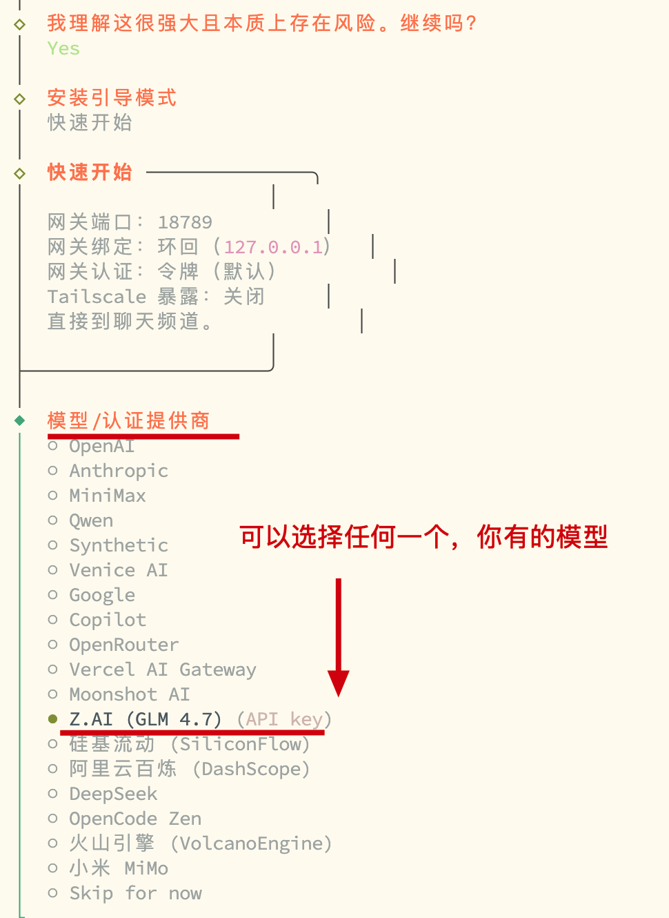 sudo openclaw onboard运行向导后,会告诉你这个软件的安全提示,你可以通过←→选择 yes 安装即可。再往后,会进行模型的选择,这里支持好多模型,本案例使用的 glm apikey (opens new window) - 之后,一系列选择后(不分可以跳过),包括通信渠道(飞书)也可以先跳过,即可完成安装。安装后可以通过