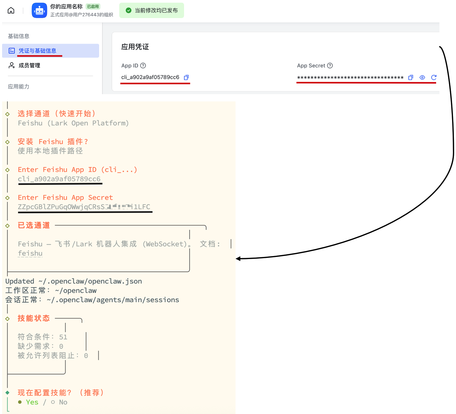 - 把你的应用凭证,配置到 openclaw 应用程序里。之后继续回车。