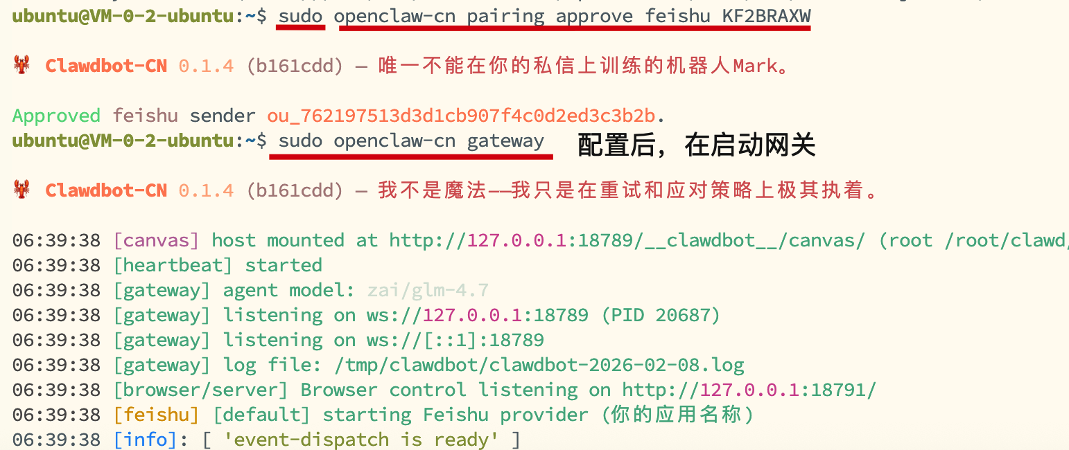 ubuntu@VM-0-2-ubuntu:~$ sudo openclaw-cn pairing approve feishu KF2BRAXW