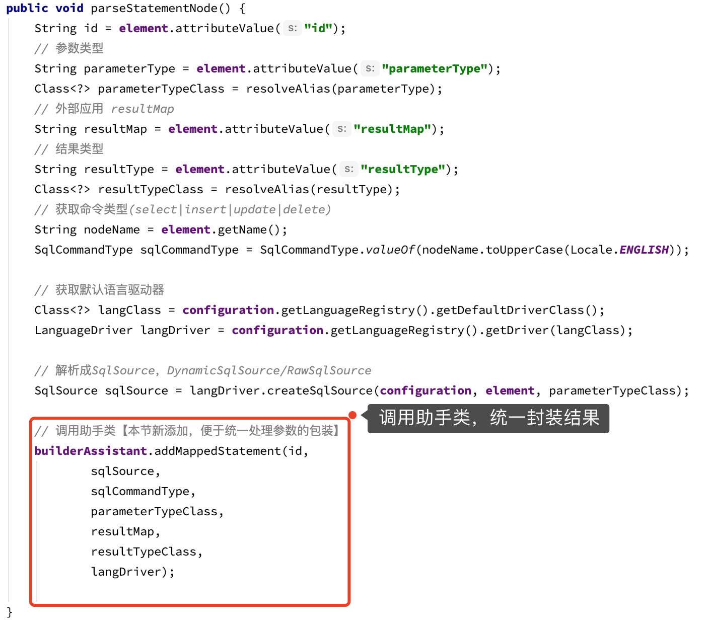 - 与上一章节相比,对于这部分的解析后的结果处理的职责内容,划分到了新增加的助手类中,这种实现方式在 Mybatis 的源码中还是非常多的,大部分的内容处理,都会提供一个助手类进行操作。