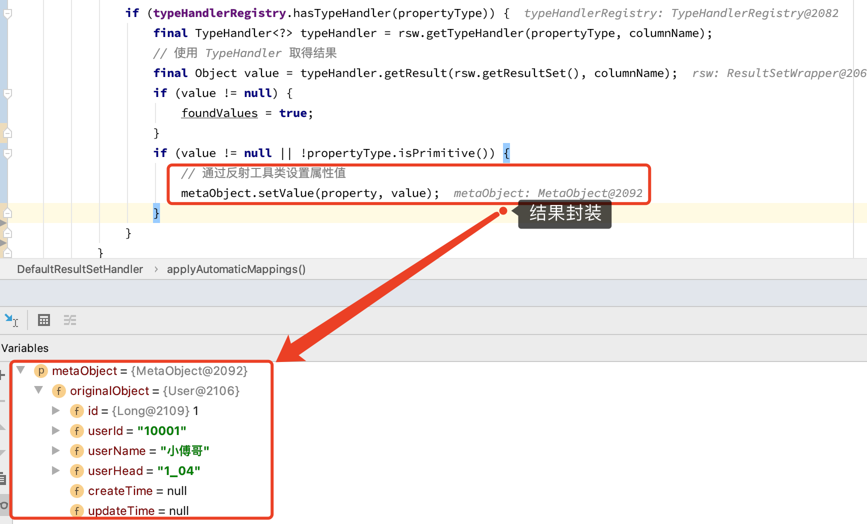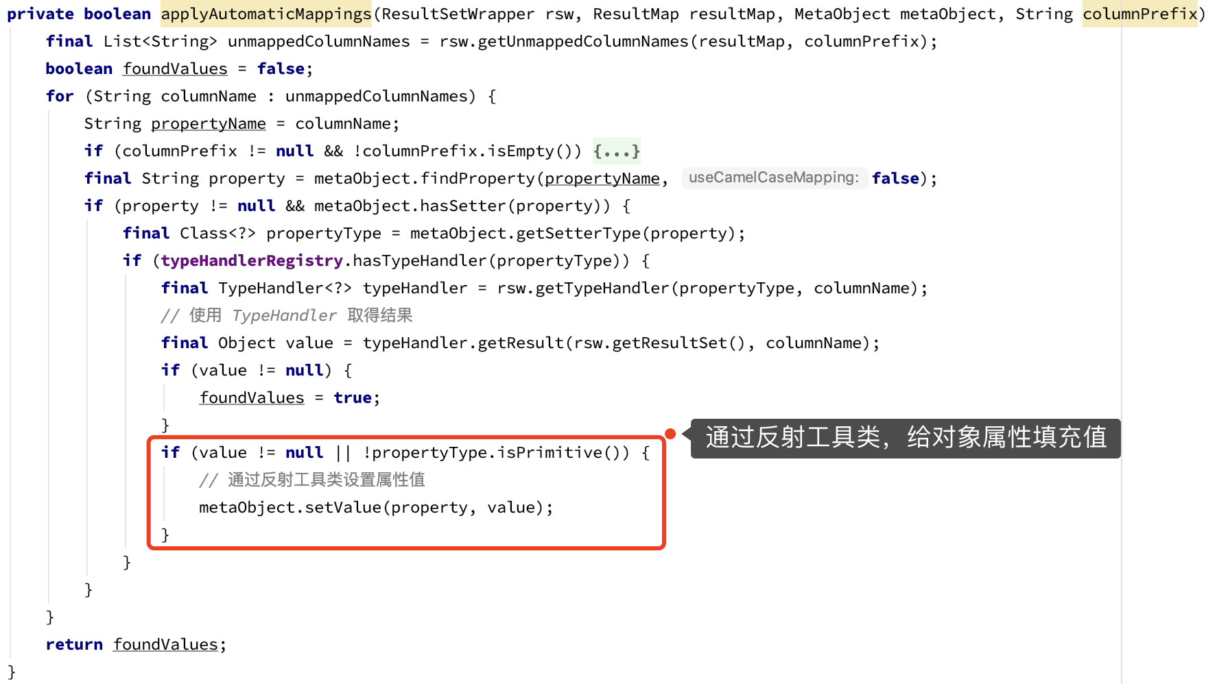 - 获取属性值后,再使用 MetaObject 反射工具类设置属性值,一次循环设置完成以后,这样一个完整的结果信息 Bean 对象就可以返回了。返回后写入到 DefaultResultContext#nextResultObject 上下文中